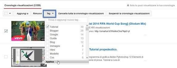 È visibile il numero dei video visti con tale Cronologia attivata. Come nel caso precedente possiamocancellare uno o più video oppure tutta la cronologia. Si può sospendere la rilevazione della Cronologia per poi eventualmente riprenderla. C’è anche la voce Tag per poter filtrare i video visti
